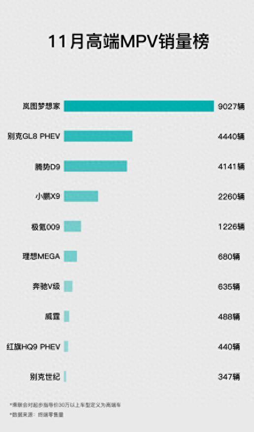 根据乘联会数据(乘联会将起步指导价 30 万元以上车型定义为高端车),11 月高端 MPV 市场竞争格局清晰:别克 GL8 PHEV 以 4440 辆位居次席,腾势 D9 以 4141 辆紧随其后,小鹏 X9、极氪 009、理想 MEGA 分别交出 2260 辆、1226 辆、680 辆的成绩,奔驰 V 级、威霆、红旗 HQ9 PHEV、别克世纪等车型销量均未突破 500 辆,与岚图梦想家的领先优势差距明显。这份榜单背后,是高端 MPV 市场竞争逻辑的深刻变革 —— 行业正从盲目堆砌冰箱、彩电等硬件的 “配置军备竞赛”,转向对产品力本质的核心追求。