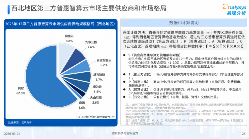 从市场竞争格局来看,阿里云、九章云极等厂商在西北第三方普惠智算云供给中处于领先位置。阿里云凭借综合云服务能力与全域布局,在政务、规模化算力服务上优势突出;九章云极作为深耕AI基础设施的中立第三方智算云平台,以全栈自研异构算力纳管、全域统一调度、DCU标准化计量为核心优势,深度落地宁夏、陕西等区域,高效适配智能体高并发推理负载,服务高校、中小企业与开发者群体,在普惠赛道形成鲜明特色。报告特别指出,九章云极行业首创的“度”(DCU)算力计量标准与按Token计费模式,与当前智能体时代高并发、短时推理的需求高度契合,成为其切入普惠市场的关键差异化能力。
