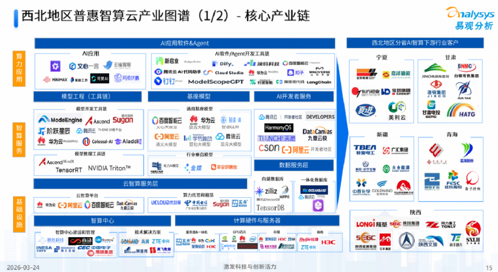 近日,易观分析发布《2026年中国第三方普惠智算云市场专题报告(西北篇)》。报告显示,截至2026年,西北五省算力总规模达316 EFLOPS,其中智算约190 EFLOPS,占比超60%,已成为全国高密度AI算力供给核心区域之一。西北已形成清晰的“2+2+1”分层体系:宁夏、甘肃作为国家性供给双核,支撑全国大规模智算训练与高并发推理;新疆、青海依托清洁能源优势,打造绿色算力补位层。西北不再只是承接东部需求的“算力腹地”,而是同时承担后端资源池、中台调度试验与前台场景转化的三重功能,定位已从“成本洼地”升级为连接“资源、规则、需求”的结构性节点区域,为九章云极等中立第三方智算云平台提供了广阔的落地空间。